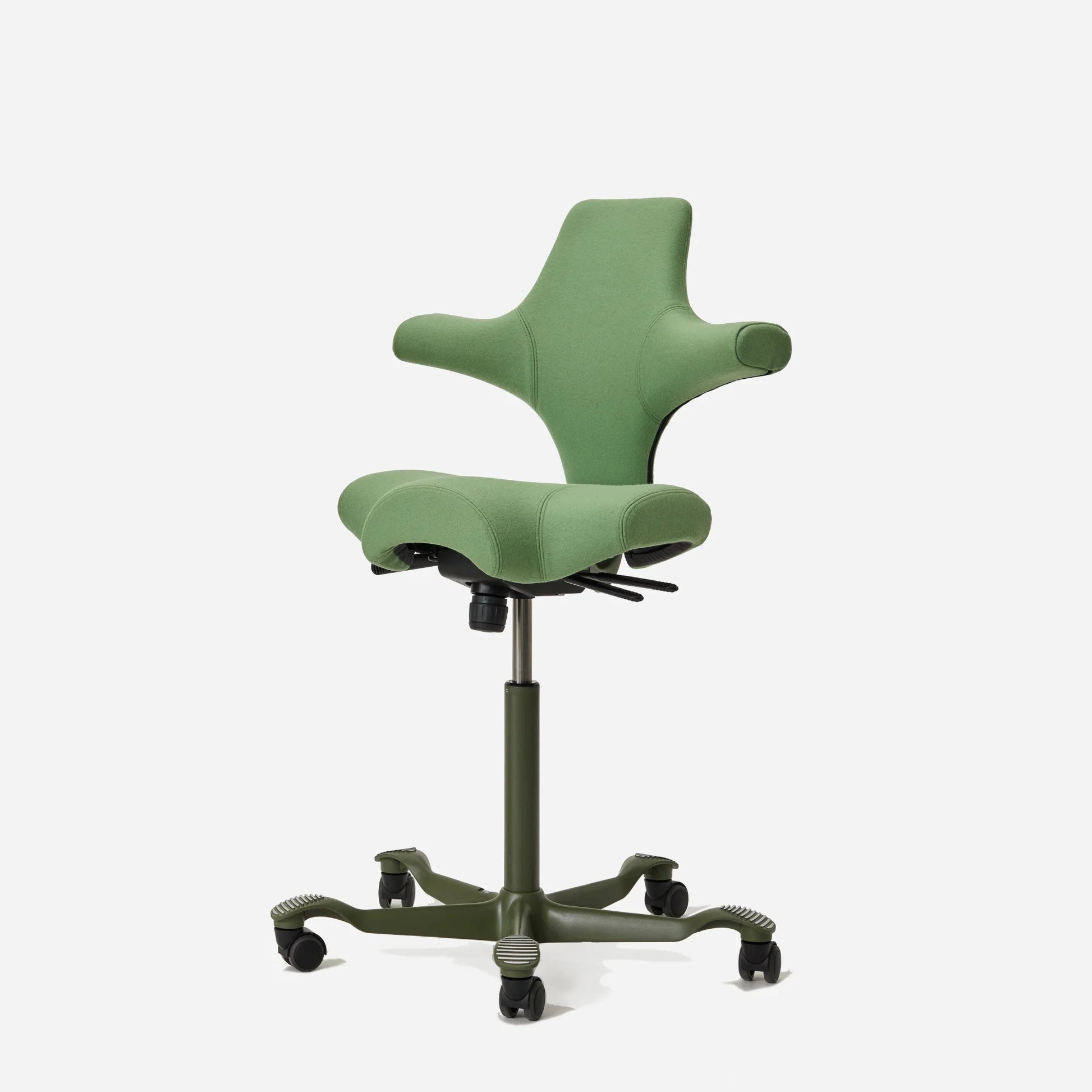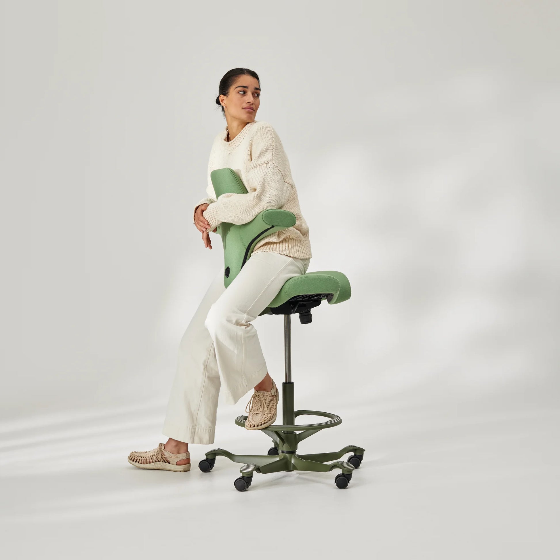 The HÅG Capisco 8106, a classic bestseller, features an adjustable saddle seat that ranges from low to standing positions, promoting dynamic movement while ensuring balanced sitting.